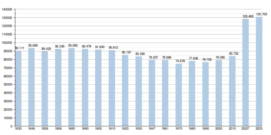 - Bron: NIS - Opm: 1830 t/m 1980=volkstellingen op 31 december; vanaf 1990= inwoneraantal per 1 januari