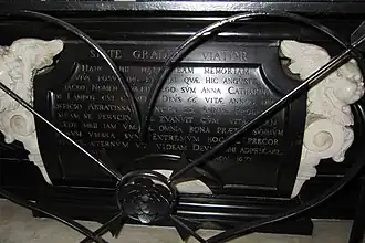- In de cartouche op de tombe richt de abdis zich rechtstreeks tot de toeschouwer in de volgende bewoordingen: "Sta even stil, reiziger, bij het marmeren gedenkteken dat ik bij leven oprichtte, voor mij en voor jou. Je vraagt: wie ik ben? Ik ben Anna Catharina de Lamboy, aan wie God in zijn goedheid 66 levensjaren schonk. Tweeëntwintig jaar lang heb ik het ambt van abdis bekleed. Tracht mijn stamboom niet na te trekken, want die is samen met mijn leven vergaan. Geloof mij, ik ben slechts een schaduw, want alles is vergankelijk, alleen het allerhoogste goed niet. Dit is het laatste wat ik je vraag, reiziger: bid voor mij, dat ik de eeuwige God mag aanschouwen. Overleden op 2 november 1675."