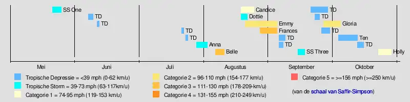| Sterkste storm | Orkaan Belle met 957 hPa, 195 km/h (1-min continu) | |||