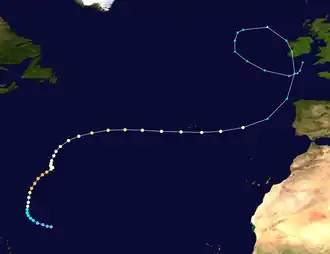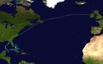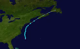 Op 17 juli ontstond op 380 km ten zuidoosten van Nantucket, voor de kust van Massachusetts een tropische depressie. Een paar uur later promoveerde de tropische depressie tot tropische storm en versnelde naar het noordoosten. Boven de golfstroom bereikte de tropische storm zijn hoogtepunt met windsnelheden van 83 km/uur en een minimale druk van 998 mbar op 17 juli. Spoedig daarna kwam de tropische storm ten noorden van de golfstroom terecht, zodat hij was afgesneden van zijn energiebron. Op 18 juli verloor hij snel zijn convectie en degenereerde tot een resterend lagedrukgebied, dat later die dag op Newfoundland landde. Nadat het het schiereiland was overgetrokken, loste het lagedrukgebied op 19 juli op boven de Atlantische Oceaan.