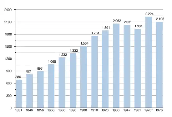 - Bronnen:NIS, Opm:1831 tot en met 1970=volkstellingen; 1976 = inwoneraantal op 31 december