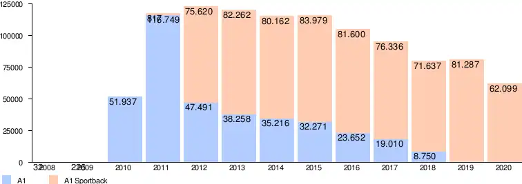 | A1 Sportback | Niet beschikbaar | 817 | 75.620 | 82.262 | 80.162 | 83.979 | 81.600 | 76.336 | 71.637 | 81.287 | 62.099 | 695.799 | ||