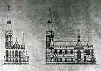 De kerk is een driebeukige kruiskerk in neogotische stijl, gemetseld in bruinrode baksteen, met siermetselwerk en horizontale banden van gele steen. De toren is zeshoekig en 66 meter hoog. In de kerk bevinden zich diverse kapellen en biechtstoelen.