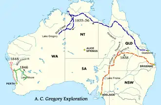 Gregory werd in 1857 gevraagd de zoektocht naar de verdwenen Ludwig Leichhardt te leiden. Er werden enkele sporen, waaronder een in een boom gekerfde 'L', gevonden. De droogte noopte de expeditie echter terug te keren.[3]
