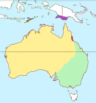 | Verspreiding van Ninox boobook ondersoorten, inclusief drie gerelateerde soorten ■ N.b.boobook ■ N.b.ocellata ■ N.b.halmaturina ■ N.b.lurida ■ N. fusca (timorboeboekuil) ■ N.b.pusilla ■ N. plesseni (alorboeboekuil) ■ N. rotiensis (rotiboeboekuil) ■ N.b.moae ■ N.b.cinnamomina