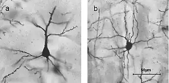 - ↑ Peters, A., Proskauer, C. C. (April 1980). Synaptic relationships between a multipolar stellate cell and a pyramidal neuron in the rat visual cortex. A combined Golgi-electron microscope study. Journal of Neurocytology 9 (2): 163–183. ISSN: 0300-4864. PMID 6160209. DOI: 10.1007/bf01205156.