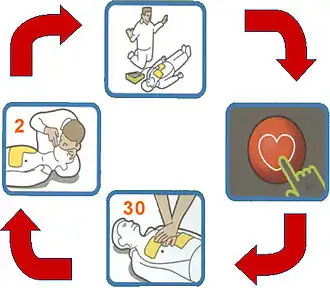 - Vroegtijdig defibrilleren: door binnen 3 tot 5 minuten na de collaps defibrillatie toe te passen (indien aangewezen), kan men de overlevingskans met 50-70% doen stijgen. Het is hier dat aed's toe dienen, omdat bij een hartstilstand buiten het ziekenhuis het vaak ettelijke minuten duurt vooraleer gespecialiseerde hulp van een ambulance (in België mug) ter plaatse is. Publiek beschikbare aed's kunnen zo de tijd vooraleer defibrillatie op een slachtoffer wordt toegepast drastisch verminderen. Of defibrillatie bij een welbepaald slachtoffer kan baten kan niet zonder hulpmiddelen van buitenaf beoordeeld worden; daarom dient men bij elk slachtoffer met een hartstilstand een aed aan te leggen als er een beschikbaar is. De aed beoordeelt dan automatisch of een elektrische schok aangewezen is. Bij het aanleggen en gebruiken van een aed moet men de toepassing van CPR zo weinig mogelijk proberen te onderbreken; een aed zal luidop aangeven wanneer men het slachtoffer niet mag aanraken.