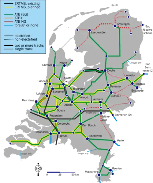 - Op de grensbaanvakken naar Enschede en Venlo is het van oorsprong Duitse systeem PZB in gebruik.