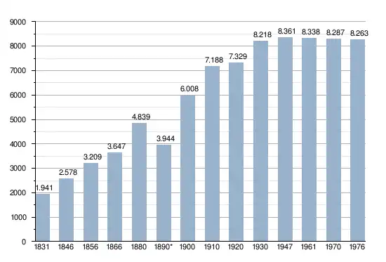 - Bron: NIS; Opm:1831 t/m 1970=volkstellingen; 1976=inwoneraantal op 31 december
