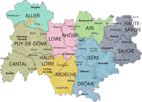 | Departementen | Ain, Allier, Ardèche, Cantal, Drôme, Grand Lyon, Haute-Loire, Haute-Savoie, Isère, Loire, Puy-de-Dôme, Rhône, Savoie | ||