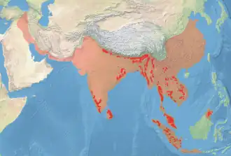 | Verspreidingsgebied van de Aziatische olifant in het rood, voormalige verspreiding in het roze | |||||||||||||