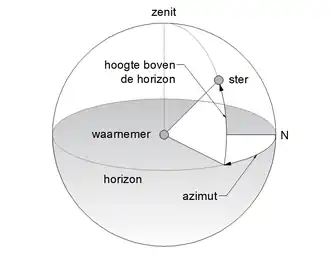 De positie van een ster aan de hemel wordt dus aangegeven door het azimut: de kompasrichting, en de hoogte: de hoek tussen de ster en de horizon. De gehele cirkel is 360°, noord=0°, oost=90°, zuid=180°, west=270°