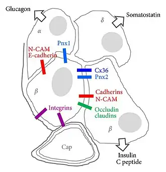 Celmembraanspecialisaties tussen endocriene cellen zijn gap junctions of zonula occludens.[14] [15]