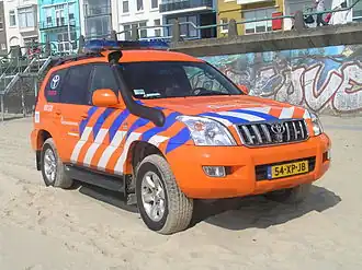 De Reddingsbrigade is als een na laatste toegevoegd aan de hulpdiensten met de officiële striping. De basiskleur is oranje (RAL 2009) en de strepen zijn blauw-wit. Tegelijk met de invoering van deze striping voor de Reddingsbrigade is een nieuw landelijk logo geïntroduceerd. Deze is vervaardigd door Aad Voermans van Aangenaam Ontwerp in Utrecht. De Reddingsbrigade bestaat uit 180 zelfstandige verenigingen waarvan de helft een operationele taak in de waterhulpverlening heeft. De koepelorganisatie heet formeel Koninklijke Nederlandse Bond tot het Redden van Drenkelingen (KNBRD), nu Reddingsbrigade Nederland. Alleen reddingsbrigades die bij Reddingsbrigade Nederland aangesloten zijn, mogen de striping en het nieuwe logo gebruiken.