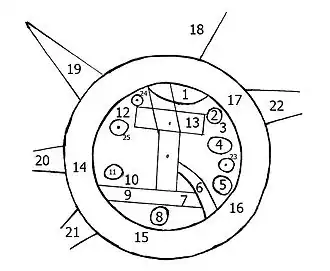 1. "Berg" (Akkadisch: šá-du-ú) 2. "Stad" (Akkadisch: uru) 3. Urartu (Akkadisch: ú-ra-áš-tu) 4. Assyrië (Akkadisch:kuraš+šurki) 5. "Der" (Akkadisch: dēr) 6. ? 7. Moeras (Akkadisch: ap-pa-ru) 8. Elam (Akkadisch: šuša) 9. Kanaal (Akkadisch: bit-qu) 10. Bit Yakin (Akkadisch: bīt-ia-᾿-ki-nu) 11. "Stad" (Akkadisch: uru) 12. Habban (Akkadisch: ha-ab-ban) 13. Babylon (Akkadisch:tin.tirki) met de Eufraat 14 — 17. Oceaan (zout water, Akkadisch:id mar-ra-tum) 18 — 22. Mythologische objecten |