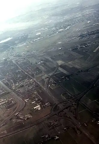 | Luchtfoto van Badhoevedorp, met de A9 in de rechterbenedenhoek en in het midden de Nieuwe Meer. | |||