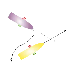 De roerganger van het paarse schip ziet het rode licht aan bakboordzijde van het gele schip en moet voorrang verlenen
