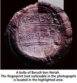 In 1975 dook op een antiekmarkt een kleizegel op met de tekst: Behoort tot Baruch, Zoon van Neria, de schrijver.[10] Dit kleizegel is toegevoegd aan de collectie van het Israel Museum. Later, in 1996, dook een tweede, identieke zegel op. De authenticiteit van beide zegels wordt betwist.[11]