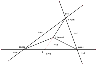 Is de simplex een gegeven driehoek in een vectorruimte, met de vectoren die wijzen naar de drie hoekpunten , dan kan een punt in het vlak van de driehoek door drie barycentrische coördinaten worden aangegeven. Het punt met barycentrische coördinaten is het eindpunt van de volgende affiene combinatie van de hoekpunten: