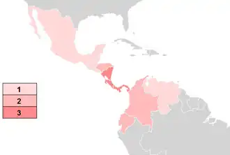 Verspreidingsgebied van de basilisken in Midden-Amerika in roodtinten.