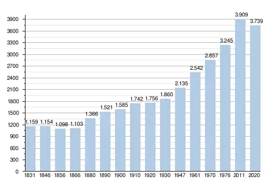 - Bronnen:NIS, Opm:1831 tot en met 1970=volkstellingen; 1976 = inwoneraantal op 31 december
