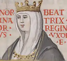 Na de dood van haar vader werd Beatrix in 1383 op elfjarige leeftijd suo jure koningin, onder regentschap van haar moeder. Johan I claimde uit naam van Beatrix de Portugese troon en riep zichzelf uit tot koning. Op 20 december 1383 viel hij Portugal binnen, veroverde Santarem en belegerde Lissabon. Hij werd in 1385 echter verslagen door de troepen van Beatrix’ oom Johan van Aviz, die zichzelf ook tot koning van Portugal had uitgeroepen.