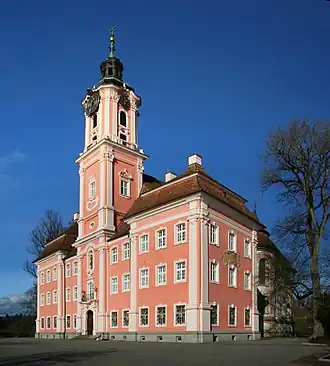 De kerk bezit een rijke rococo inrichting met fresco's van Gottfried Bernhard Göz en stucwerk, altaren en beelden van Joseph Anton Feuchtmayer, wiens bekende beeld van de Honigschlecker zich in de kerk bevindt, een putto met een bijenkorf. In het kloostergebouw voor de kerk met de markante klokkentoren is tegenwoordig een prioraat van de cisterciënzer abdij van Wettingen-Mehrerau ondergebracht.