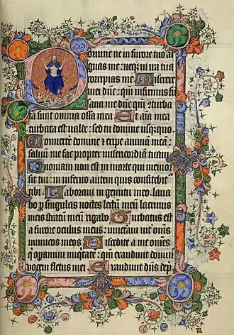 De boetepsalmen beginnen met een gehistorieerde initiaal van vijf lijnen hoog met Christus als rechter op het einde der tijden. Het dodenofficie start met een initiaal van zeven lijnen hoog die het dodenofficie afbeeldt. De tekst is versierd zoals bij de getijden.