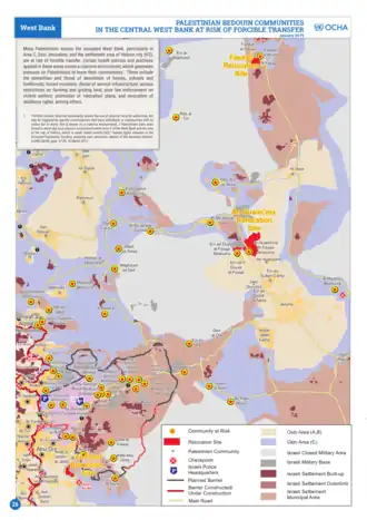In september 2014 begon Israëls civiel bestuur, in weerwil van de aanbeveling van het Hooggerechtshof, stappen te ondernemen om duizenden bedoeïenen van hun leef- en grondgebied ten oosten van Jeruzalem met geweld te verdrijven naar een nieuwe stad in de Jordaanvallei[18] ten gunste van de uitbreiding van nederzettingen.