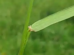 De plant vormt een losse pol en wordt 0,3–1 m hoog. Het jonge blad is opgerold. Het donkergroene en van onderen glanzende blad is 3–5 mm breed en 10–20 cm lang. De oortjes aan de voet van de bladschijf zijn kaal. Het tongetje is vrij kort, groenig, niet doorzichtig, vaak omgekruld en steekt niet boven de bladschede uit. De onderste bladscheden verweren tot bruine vezels.