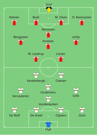 De Denen wonnen met 3-2. Larsen lokte een strafschop uit en scoorde later ook het beslissende doelpunt. Ook Arnesen en Brylle pikten een doelpunt mee. Bij de Belgen kwamen de doelpunten van Ceulemans en Vercauteren.