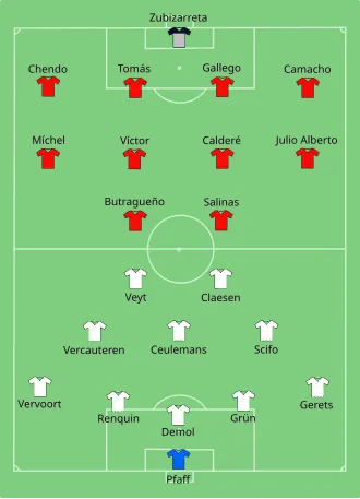 In de kwartfinale was de tegenstander Spanje, dat een ronde eerder Denemarken met 1-5 had ingeblikt. Spanje beschikte tegen de Belgen over bekende namen als Emilio Butragueño, José Antonio Camacho, Andoni Zubizarreta en Julio Salinas. België was in theorie opnieuw de underdog, maar kwam als eerste op voorsprong. Aanvoerder Ceulemans maakte zijn tweede van het toernooi.