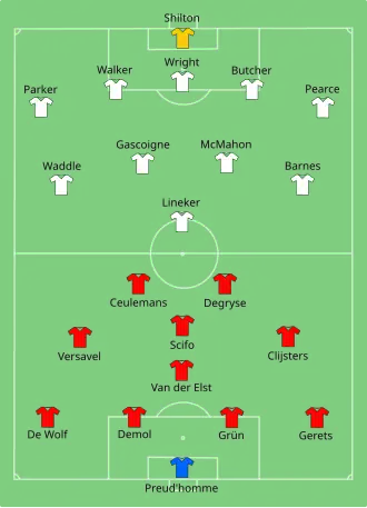 België werd tweede en nam het in de volgende ronde op tegen Engeland, de winnaar van groep F. In Bologna bleef het na 90 minuten 0-0. In de verlengingen viel er ook niet meteen een doelpunt uit de lucht, waardoor er strafschoppen in de maak leken. Maar net voor het einde van de verlengingen, in de 119e minuut verlengde David Platt een vrije trap met een knappe volley in doel. Doelman Michel Preud'homme was geklopt en Engeland mocht door. Ondanks een carrière bij onder meer Juventus, Arsenal en Aston Villa is Platt in België vooral bekend om zijn winning goal tegen de Rode Duivels.