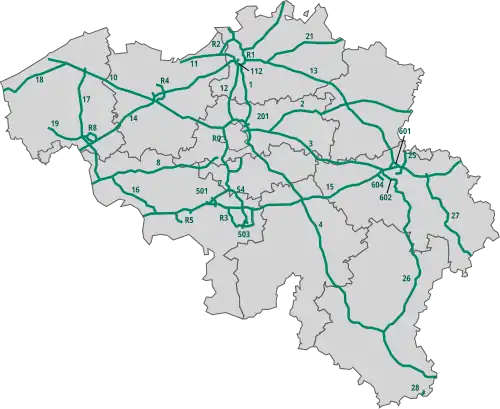 Autosnelwegen (met A-nummer) en belangrijke ringwegen (Autosnelwegen met R-nummer) in België