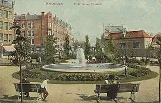 Het originele plantsoen aangelegd in 1906 was voor wat betreft hekwerken en fontein ontworpen door Jan Ernst van der Pek, die ook de aanbesteding had uitgeschreven. Inrichting kwam tot stand onder begeleiding van genoemd comité, dat het plantsoen op 8 juli 1907 (8 juli is de geboortedag van Janssen) overdroeg aan gemeente Amsterdam.[1] [2] Het plantsoen verviel tot chaos in de eerste vijftig jaar. Met name de Tweede Wereldoorlog deed het plein geen goed. Er werd een gaarkeuken geplaatst, die na de oorlog omgebouwd werd tot werkplaats. Hiervoor werd het plantsoen afgesloten. Het raakte daardoor in verval en in 1951 (toen het huurcontract afliep) kwamen er initiatieven om het plantsoen om te bouwen tot speelplaats. Het zou tot 1954/1955 duren voordat het opgeleverd werd. Op de plaats van de oude fontein kwam een pierenbad met fonteintje van stadsarchitecte Ko Mulder. [3]