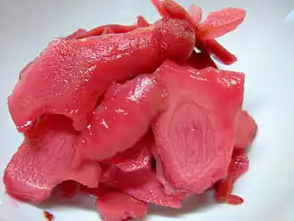 Beni Shoga (Japans: 紅生姜) is gember gepekeld in umezo (ook wel ume azijn genoemd), waardoor het een rode kleur heeft. Het is een veel voorkomende topping bij Japanse gerechten, zoals okonomiyaki en gyudon.