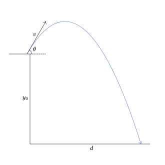 Uit de formule volgt dat bij een vlak terrein dus y0 = 0 het bereik d het grootst is voor een hoek θ = 45°.