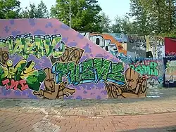 Graffitikunstenaars, waaronder leden van de SOL-crew en internationale leden van Loesje werken samen aan de muur, in de zomer van 1997.