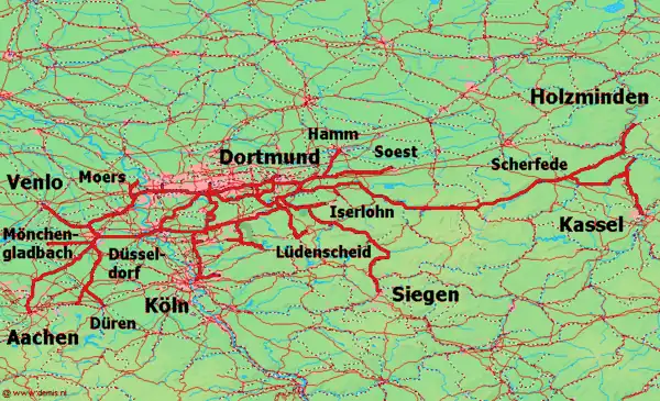 Naast vele kleine uitbreidingen volgde er tot 1876 een verlenging in oostelijke richting met de Obere Ruhrtal-Bahn via Arnsberg, Bestwig, Brilon-Wald en Warburg naar Holzminden aan de Wezer. Hier nam de BME op 17 april 1868 de Hessische Nordbahn met een traject van 130 km van Gerstungen via Bebra en Kassel naar Karlshafen. Op de linker Rijnoever werd het net in 1870 uitgebreid met de trajecten van Rheydt-Odenkirchen naar Eschweiler-Aue en Düren met 66 km uitgebreid.
