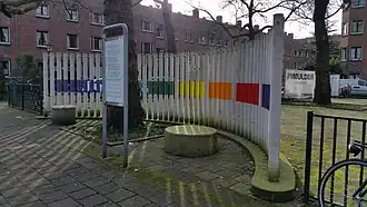 Bertelmanplein 2-18 in 2012 met daarvoor toestel van Van Eyck -