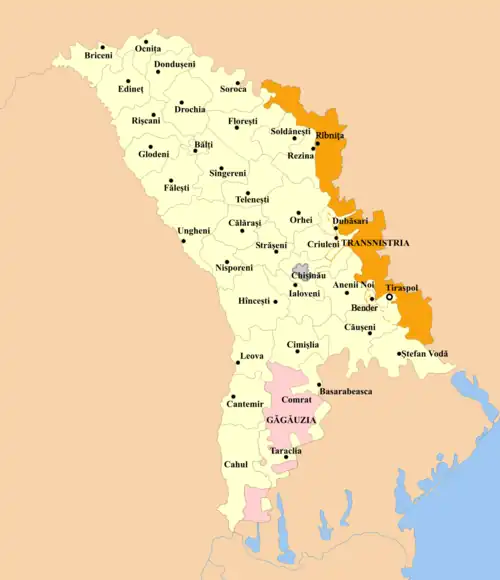 - Eenheid met speciale autonomie Transnistrië (Unitățile din Stînga Nistrului, condiții speciale de autonomie), 79 gemeenten, waarvan met stadstitel: Camenca, Crasnoe, Dnestrovsc, Dubăsari, Grigoriopol, Maiac, Rîbnița, Slobozia, Tiraspol en Tiraspolul Nou.