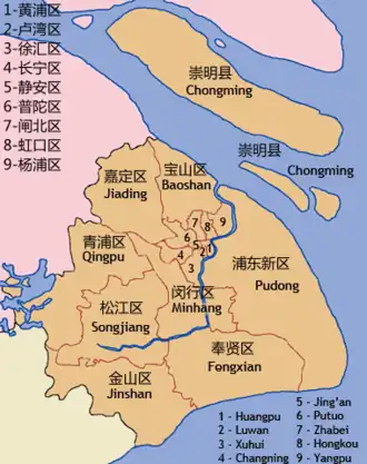 | Pudong New District (Pǔdōng Xīn Qū) heette Chuansha County tot 1992 Sinds 2009 uitgebreid met het voormalig Nanhui district (Nánhuì Qū) heette Nanhui County tot 2001 |