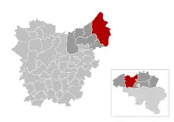 | Ligging van de fusiegemeente binnen het arrondissement Sint-Niklaas en binnen de provincie Oost-Vlaanderen | |||