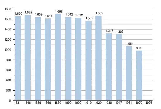 - Bronnen:NIS, Opm:1831 tot en met 1970=volkstellingen; 1976 = inwoneraantal op 31 december
