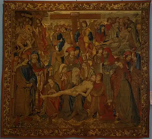 Het tapijt toont simultaan drie scènes uit de Passie: centraal de bewening van Christus, linksboven zijn nederdaling ter helle en rechtsboven zijn graflegging. De centrale groep gaat terug op de Piëta die Perugino schilderde voor de kloosterkerk van San Giusto alle mura te Firenze (ca. 1493). Hij toont Maria met Christus op haar schoot, het hoofd ondersteund door Johannes de Doper en de voeten door een biddende Maria Magdalena. De man met het hand op het hart die net achter Johannes staat, draag het opschrift PHILIEP. Mogelijk was de apostel Filippus de patroonheilige van de opdrachtgever.
