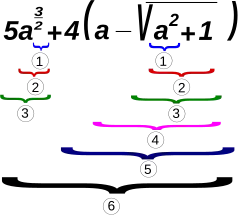 - ↑ Voorbeeld: twijfel over volgorde van worteltrekken en vermenigvuldigen in verdwijnt door bovenstreep of haakjes: en