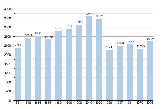 - Bronnen:NIS, Opm:1831 tot en met 1970=volkstellingen; 1976 = inwoneraantal op 31 december