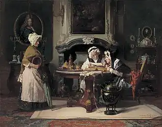 Bakker Korff was gespecialiseerd in dit soort genretaferelen met een ironische ondertoon. Voor de vrouw zou één van zijn zussen model hebben gestaan. De monumentale rococo schoorsteenmantel komt ook voor op het schilderij De aanbevelingsbrief, dat voor het laatst gesignaleerd werd bij Kunsthandel Simonis & Buunk in Ede. De schoorsteenmantel bevindt zich volgens het Centraal Museum in de Bakker Korff-kamer van Museum De Lakenhal in Leiden.