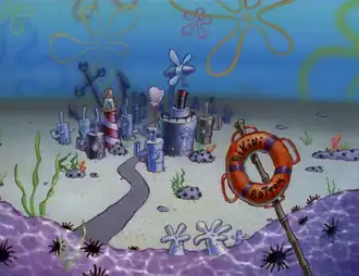 - Het restaurant van Meneer Krabs. Niet in elke aflevering wordt het restaurant de Krokante Krab genoemd, in sommige afleveringen spreekt men over de Korstige Krab.