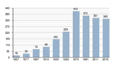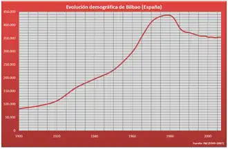 - Opm: Bevolkingscijfers in duizendtallen; aanhechting van Abando(1897), Begoña, Deusto, Erandio (1940), Derio (1966), Lujua, Sondica en Zamudio (1970); afstand van Derio (1983), Erandio, Loiu, Sondika en Zamudio (1991)